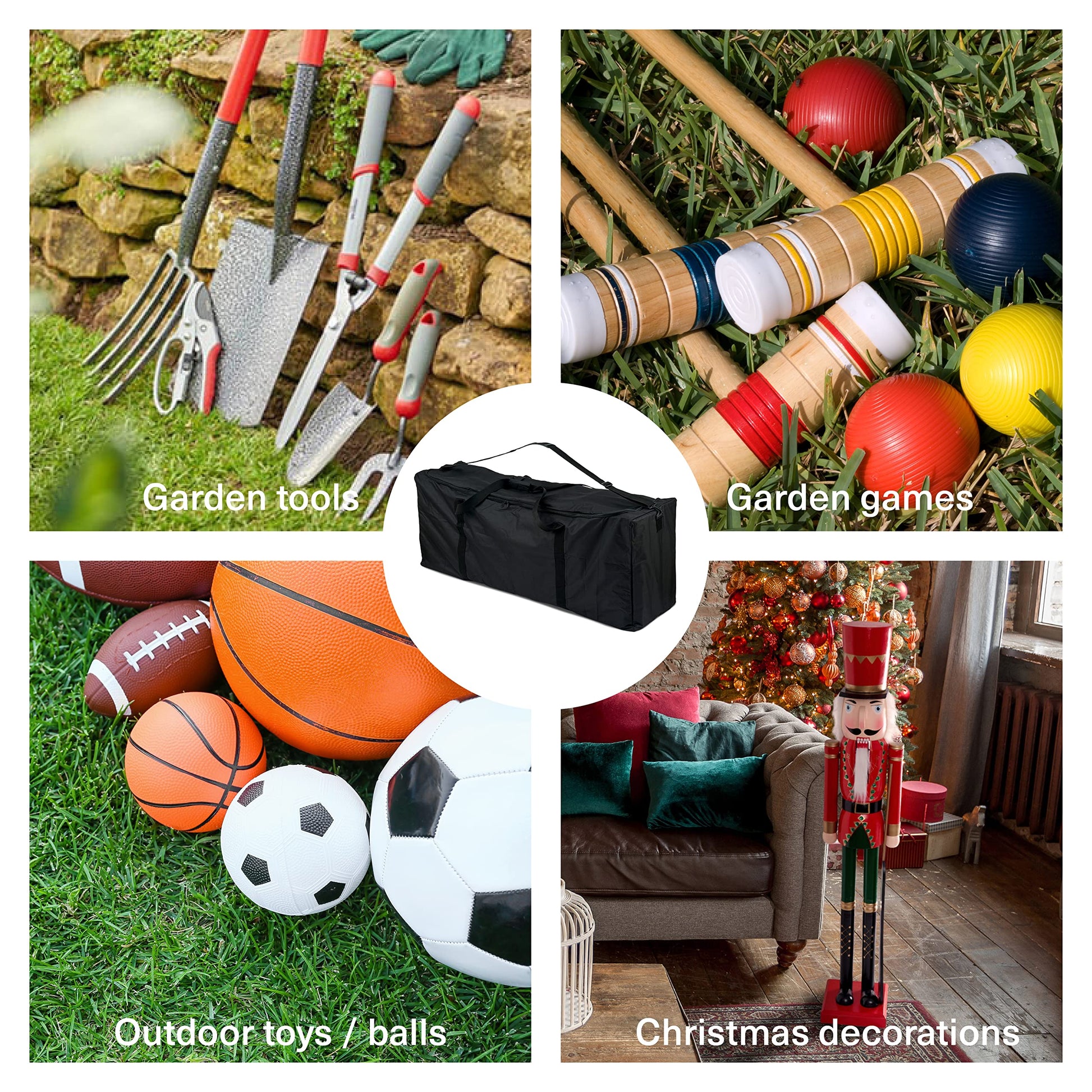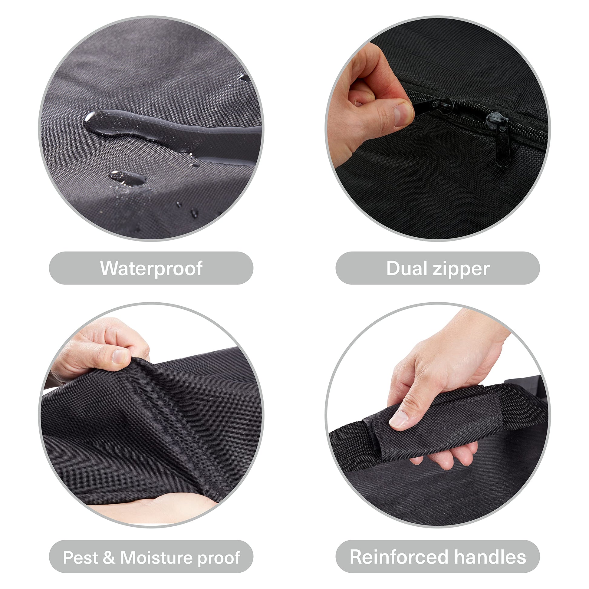 "Durable Material - This large bag protects your clothes, pillows, Christmas decorations, etc. from dust, moisture, and moths. The storage bag is also UV protected, tear-resistant, and made of double-stitched 600-denier fabric.","Multipurpose - This bag is not limited to Christmas trees, but offers versatile storage options for a variety of items. Use it as storage in the attic to organize household items, for your sports equipment, or other items you want to keep neat.","XXL Storage Bag - The generous dimensions provide enough space for comforters, pillows, seat cushions, winter clothing, and more.","Waterproof Protection - The black storage bag features strong mesh handles for easy carrying. Also perfect as a moving bag.","Satisfaction Guarantee - We stand behind the quality of our storage bag with a 100% guarantee. If you have any issues with your purchase, please contact us."