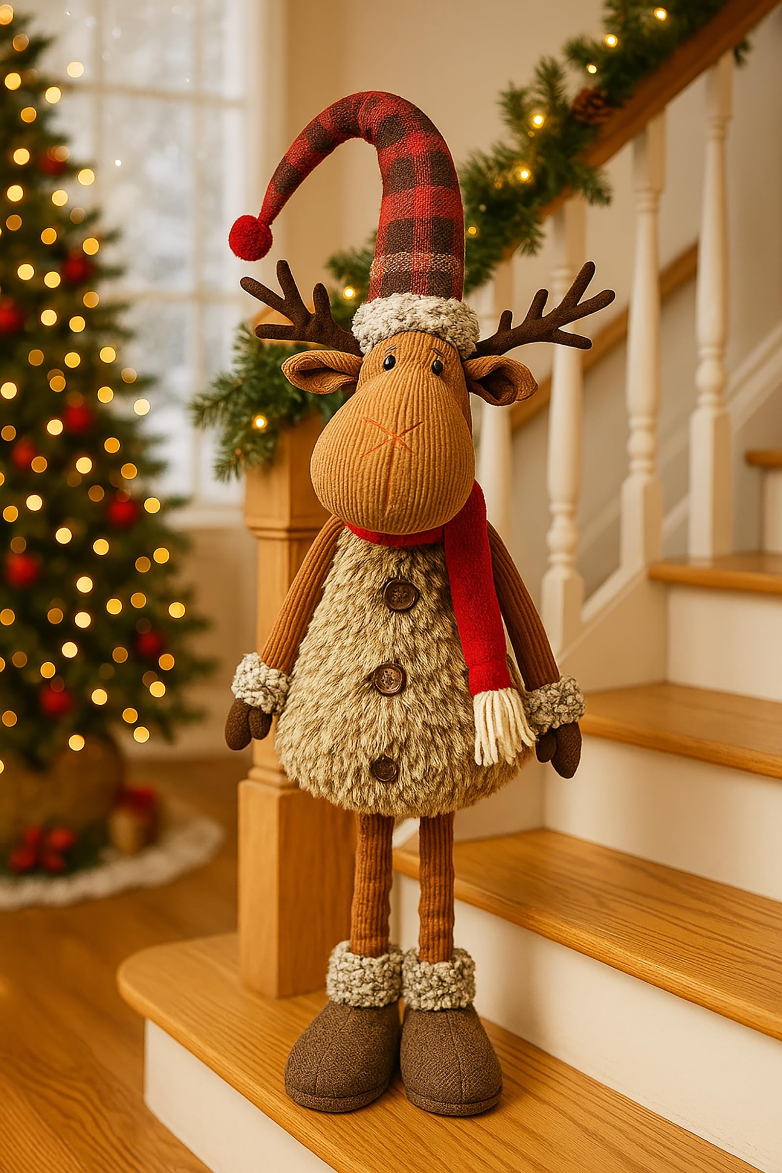 KAMACA XL Christmas elk decoration figure with extendable telescopic legs fabric figure with fur, scarf & hat standing Christmas decoration for staircase living room entrance gift (XL telescopic elk 98 cm)