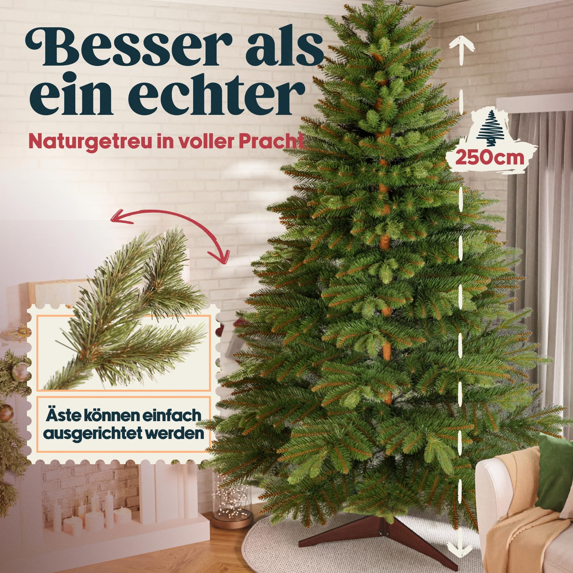 "✅ Deceptively real artificial Christmas tree – as if freshly cut: Our lifelike fir tree at 250 cm height impresses with an impressively realistic look. The harmonious interplay of dense PVC branches, high-quality PE injection-molded tips, and a lifelike brown trunk make this tree the festive highlight in any living room.",