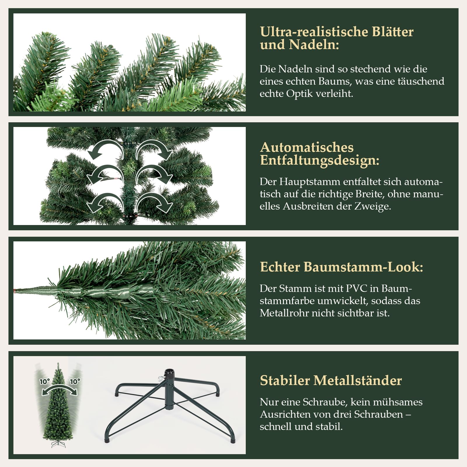 ["【Lush Branches and Realistic PVC Needles】 Inspired by real fir needles, the needles of this 180cm Artificial Christmas Tree are made of high-quality, environmentally friendly PVC that is absolutely safe and looks real. 618 branch tips and simple green help recreate a real Christmas tree.","【Narrow Design in Tight Spaces】 This Artificial Christmas Tree is designed in a slim pencil shape, which is unique and space-saving. Its slim body makes it perfect for placing in corners, small spaces, or areas with limited floor space.","【Easy Storage】 There is no need to buy trees every year. No tree needles required. Simply store the 180 cm artificial Christmas tree in a storage bag after Christmas to save space.","【Safe and Stable Christmas Tree】 This artificial fir tree not only guarantees a stable hold, but also allows you to enjoy Christmas worry-free by using non-flammable materials.","【Unlimited Decoration】 The dismantled artificial Norman fir tree can be stored in its original packaging. If you are looking for more Christmas decorations, simply enter SALCAR Christmas decorations in the search field."]